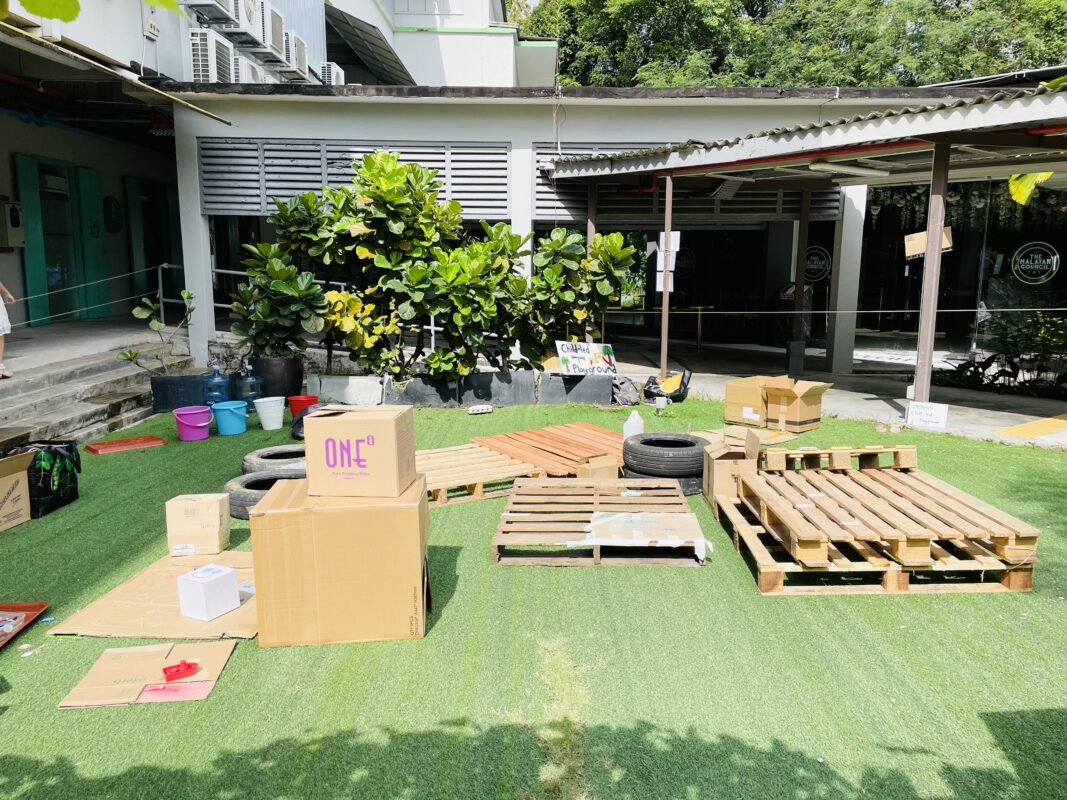 Composting itself is a fast job but there are other tasks to be done at the compost area. We built a fence around the composting area using repurposed bamboo poles and a bamboo mat so that it looks tidier.
